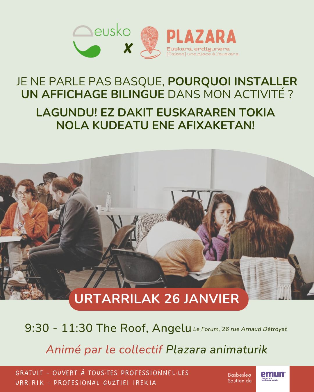 Euskal Moneta et le collectif Plazara vous invitent à un atelier pratique de 2 heures pour comprendre pourquoi et comment mettre en place un affichage bilingue euskara/français, simplement et efficacement.